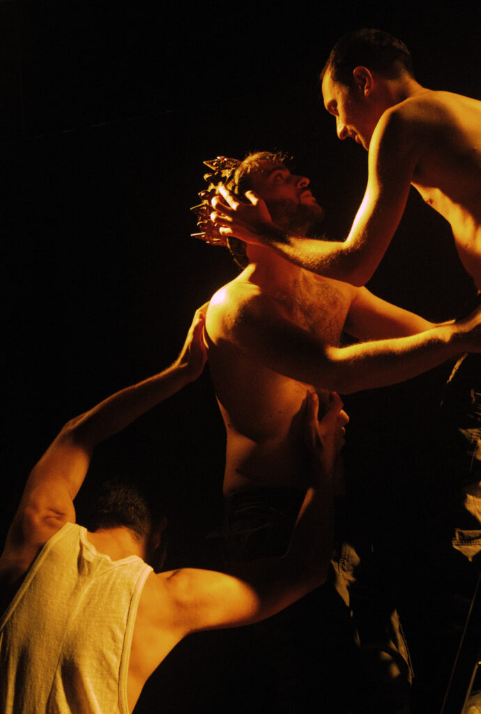 In scena, oltre i due protagonisti, le tre parche, simboli di quel fato sia benevolo che maligno, imparziale, che conduce ogni azione e ogni scelta. Il loro è un lavoro fisico corale, come un corpo di ballo che fa da sfondo alle vicende dei protagonisti, o meglio una scenografia umana, da cui arrivano input: segnali, voci, canti, richiami sonori, impulsi di movimento, proposte di caratterizzazione dello spazio, gestione dell’assetto tecnologico e musicale. All’interno dei quadri le parche rappresentano la classicità ellenica e hanno una funzione narrativa. Ci agganciano e ci riconducono alle vicende narrate nell’Iliade. Nel costume, nella posizione che occupano nello spazio, ma soprattutto nel linguaggio, esse si discostano completamente dagli altri personaggi.